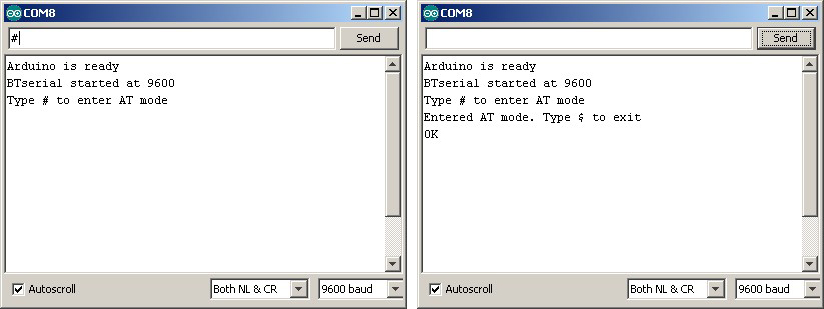 The following sketch is used to talk to the BT module. Run the sketch and put the HC-05 in to AT mode.