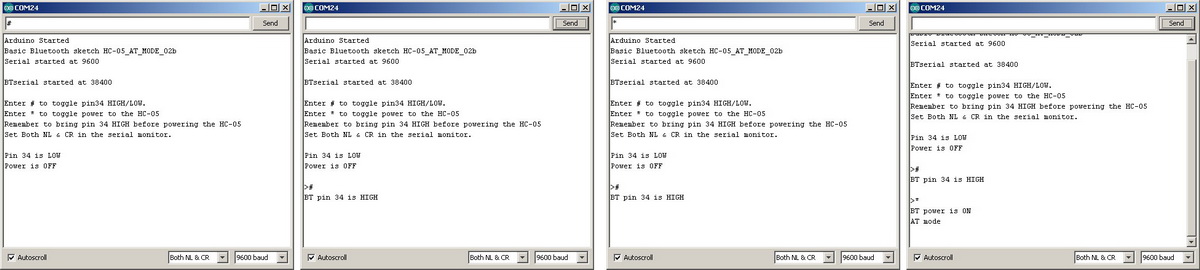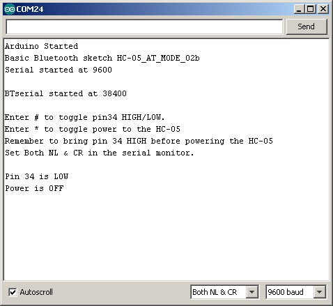 In this example the Arduino fully controls the HC-05. The Arduino pin D4 connects to a PNP transistor which is used as a switch to control the power and D5 is connected to the HC-05 pin 34 to control AT mode. Of course you can control the HC-05 manually if you wish.This used to be my preferred method but I have found that once I have set up a module I seldom change it and it has become more convenient to use the button switch or a temporary connection to pin 34. The benefit of this example is that the Arduino can control the process. Also, certain commands only work when pin 34 is HIGH. Using this method allows you to keep pin 34 HIGH.